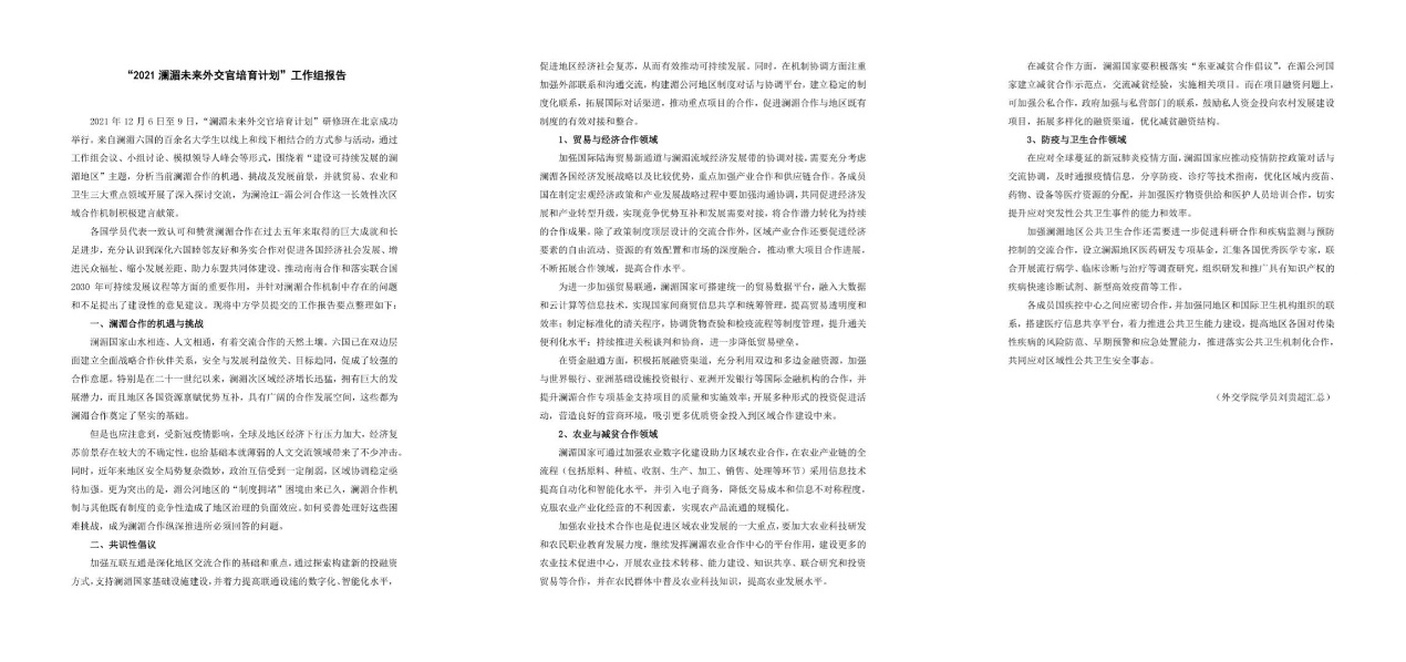 今年是澜湄合作成立五周年,5年来,澜湄合作经历了培育期、快速拓展期,迈入了全面发展新阶段,此次“澜湄未来外交官培育计划”研修班的举办因此具有了特殊的纪念意义。柬埔寨代表团领队、柬埔寨合作与和平研究所Charadine Pich表示,参加此次活动的柬埔寨学生收获很大,不仅开阔了视野,而且对外交工作有了切身体验。泰国代表团领队、泰国高等教育科学、研究和创新部Somkiat Kamolpun表示,活动非常成功,希望项目持续举办。通过参加此次研修班,不少青年代表对未来成为外交官表现出更为浓厚的兴趣,表示愿意做澜湄合作的亲历者、见证者,更要做澜湄合作的建设者和推动者,共同推进澜湄国家命运共同体建设。