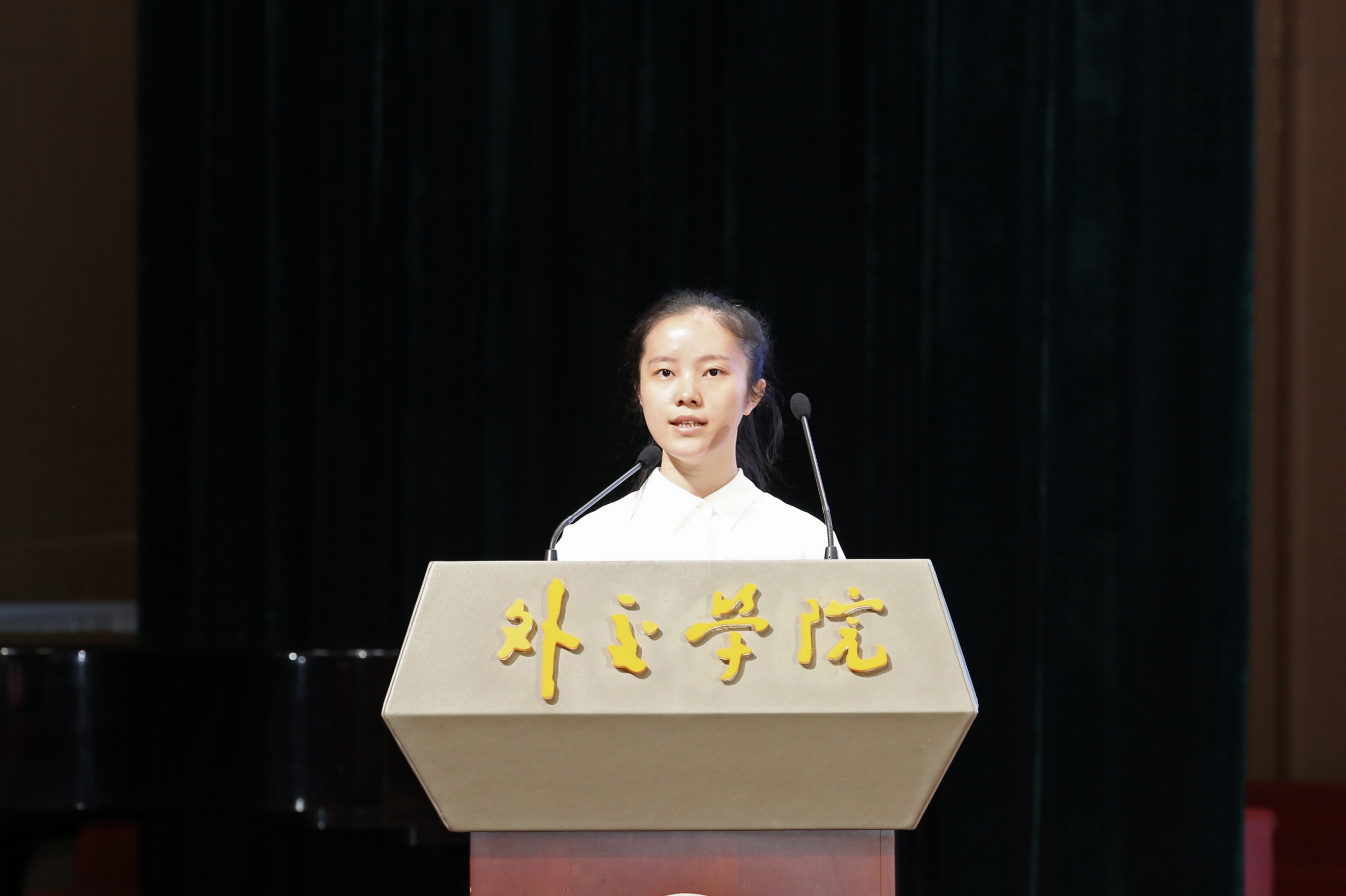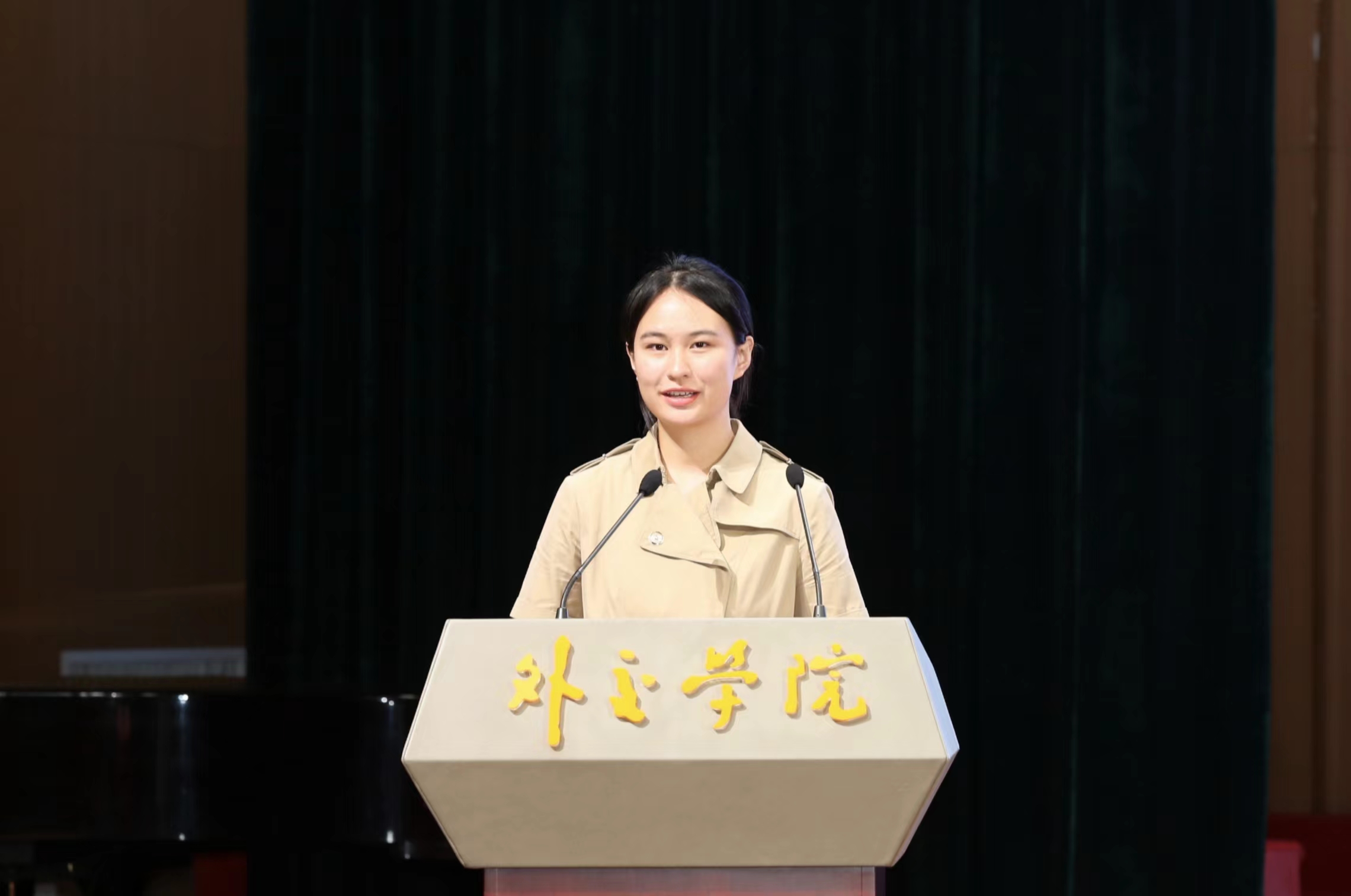 研究生部2021级钟怡琳同学代表在校生发言。她以 “国际政治置身全国、全球,如何做一名合格的外院人”为题,分享了在联合国工业发展组织实习的经历,强调要成为一名合格的外院人,需要识大变局,有胸怀天下的家国情怀;立大变局,有敢为人先的创新精神;塑大变局,有经世致用的干事本领。