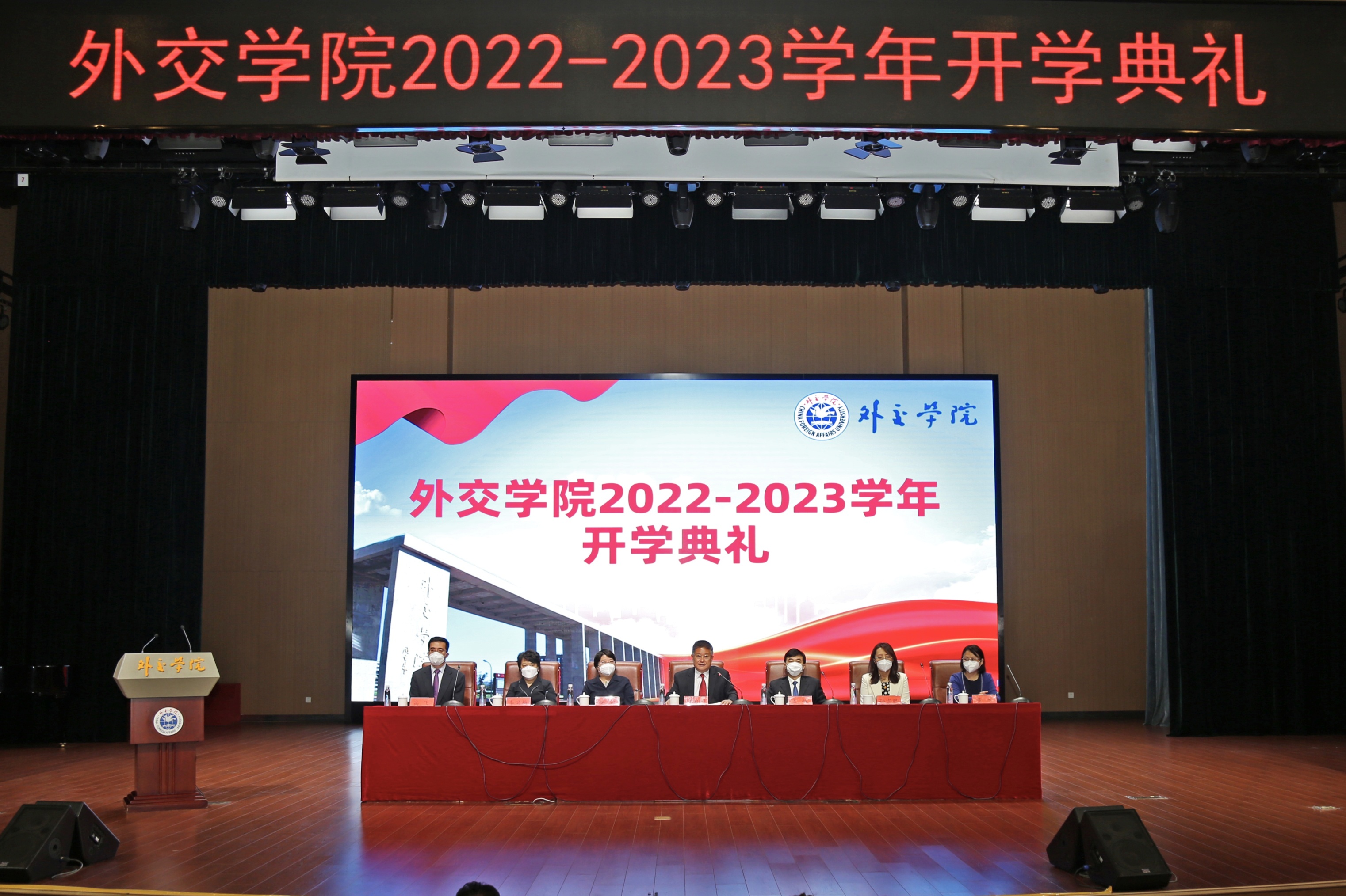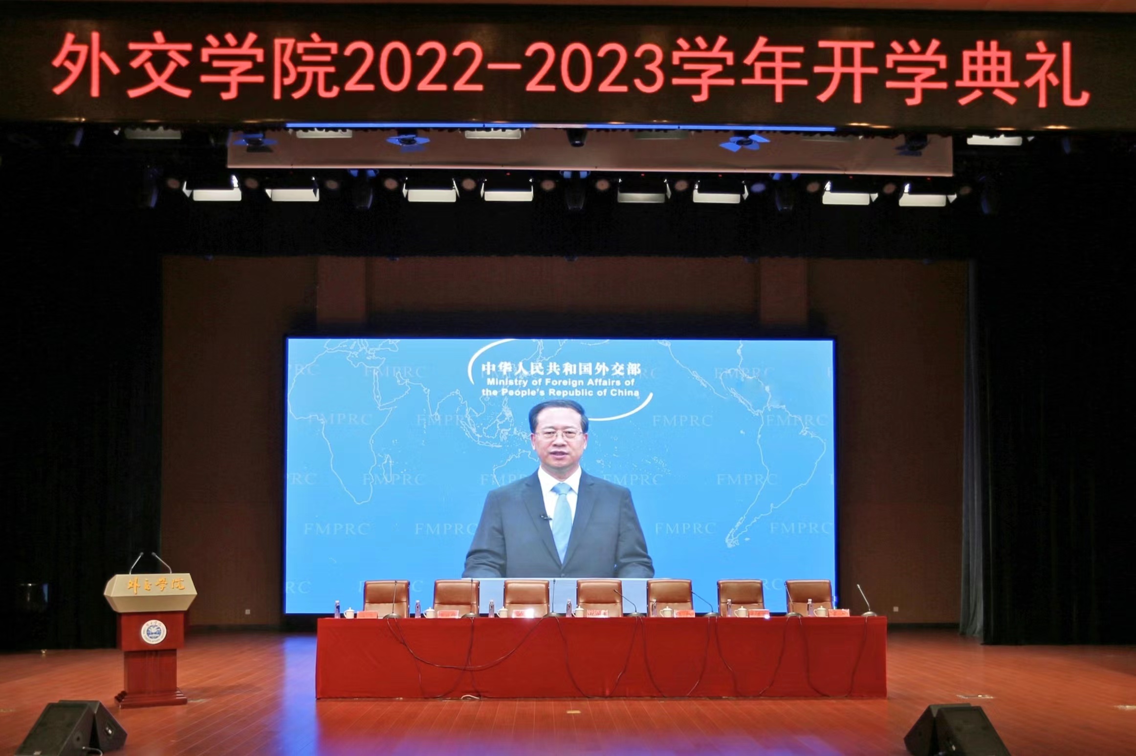 9月30日上午,外交学院2022-2023学年开学典礼在沙河校区礼堂隆重举行。外交部副部长马朝旭专门通过视频发表重要讲话,外交学院党委书记崔启明、院长王帆、专职党委副书记安青、副院长孙吉胜、副院长李洪梅、党委副书记董杰、副院长高飞、各院系部所负责人、新入职教师、2022级新生等参加典礼,崔启明书记主持大会。