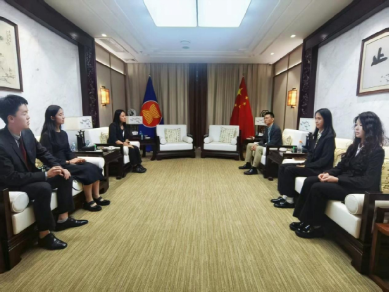 会议期间,我院师生走访中国驻东盟使团。中国驻东盟使团临时代办傅峰山对我院师生表示欢迎,向师生们介绍了中国与东盟关系的历史发展,并与同学们交流参会感受。