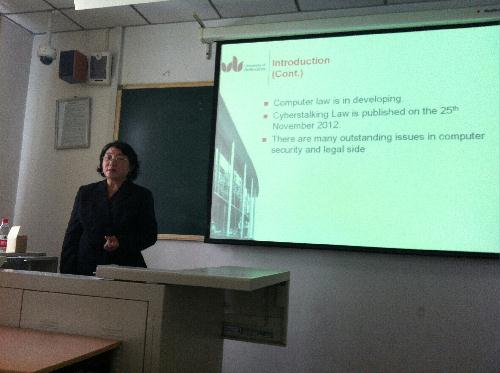 2013年4月12日,受外交学院国际法系邀请,英国贝德福德大学计算机科学系冯晓华教授访问我院,并为我院学生主讲了“计算机安全及法律取证”的讲座。国际法系许军珂教授出席并主持了本次讲座。