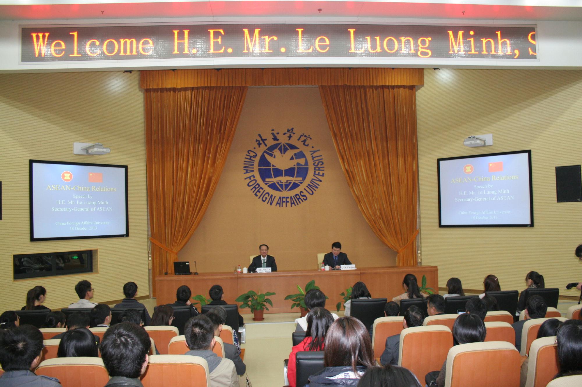 2013年10月18日上午,东南亚国家联盟(简称东盟)秘书长黎良明先生访问我院沙河校区并发表演讲。中国常驻东盟大使杨秀萍女士、东盟秘书处对外关系局局长帕朗尼潘先生以及马来西亚、菲律宾、新加坡、泰国、越南等国家驻华使馆官员随同来访并出席了演讲活动。外交学院院长赵进军、党委书记秦亚青、副院长江瑞平会见了来宾一行。赵进军院长对东盟客人的来访表示诚挚的欢迎,并与黎良明秘书长就东亚合作、中国东盟关系以及智库合作等问题交换了看法。
