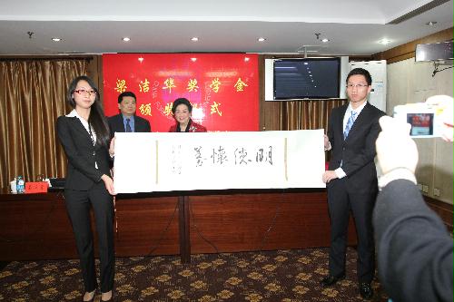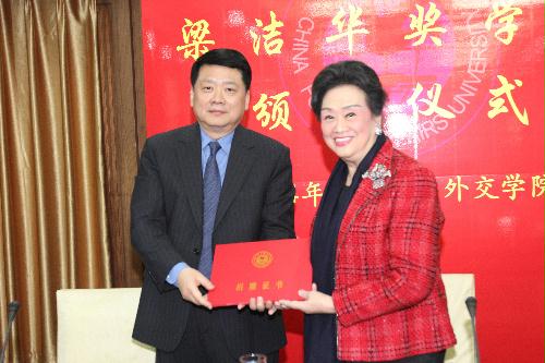 2014年11月13日下午,我院在展览路校区隆重举办首届“梁洁华奖学金”颁奖仪式。梁洁华艺术基金会主席、我院董事梁洁华博士、秦亚青院长、江瑞平副院长等学院领导及相关部门负责人和40余名获奖学生参加颁奖仪式,江瑞平副院长主持仪式。