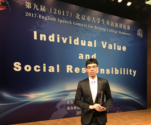 北京市大学生英语演讲比赛自2009年创办以来,已成为北京地区规模最大、影响力最高的英语演讲赛事之一,英语系学生已多次在该比赛中斩获佳绩。值得一提的是,唐杰同学自入学以来,相继在“21世纪杯”全国英语演讲比赛、“外研社杯”全国英语演讲比赛和北京市大学生英语演讲比赛等重要英语赛事中均闯入决赛并荣获优异成绩,为外交学院赢得了诸多荣誉。在此热烈祝贺唐杰同学!感谢英语系创新实践训练中心演讲团队的赛前指导和培训!同时感谢学院相关部门的大力支持!
