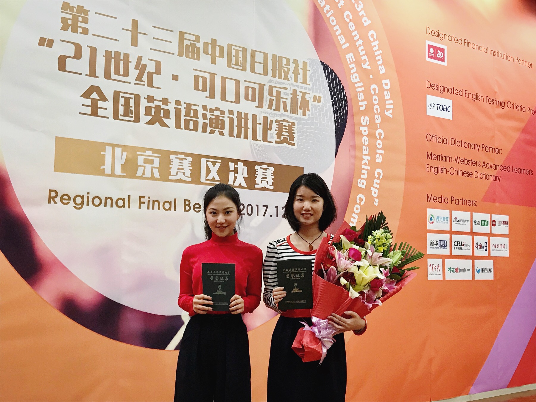 2017年12月9日,第23届中国日报社“21世纪•可口可乐杯”全国英语演讲比赛北京赛区决赛在中央财经大学举行。我院英语系本科一年级的丁青筠同学和二年级的肖晓晓同学代表外交学院参赛,与来自北京二十余所高校的31名选手同台竞技。丁青筠同学勇夺大赛冠军,肖晓晓同学荣获一等奖(第五名),丁青筠同学成功晋级明年的全国赛。