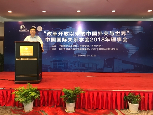 2018年6月21日,以“改革开放以来的中国外交与世界”为主题的2018年中国国际关系学会理事会在苏州召开。本次理事会由中国国际关系学会与学会理事单位苏州大学共同主办,苏州大学政治与公共管理学院和苏州大学国际问题研究所承办。来自外交学院、中共中央党校、吉林大学、复旦大学、同济大学、中山大学、上海外国语大学、苏州大学、现代国际问题研究院等会员单位的80余位专家学者及学生代表参加了会议。