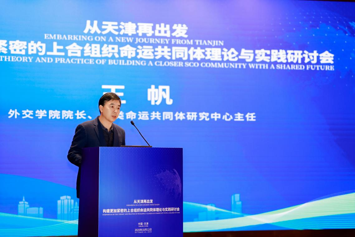 10月12日,由人类命运共同体研究中心指导,天津市人民政府外事办公室和天津外国语大学主办的“从天津再出发:构建更加紧密的上合组织命运共同体理论与实践”研讨会在天津外国语大学举办。外交学院院长、人类命运共同体研究中心主任王帆应邀出席会议并致辞。外交部欧亚司副司长毛文翀、哈萨克斯坦驻华使馆公使衔参赞沙尔卡尔巴耶夫·阿斯卡尔、天津市外办主任栾建章、天津外国语大学党委书记周红蕾等领导出席会议,上海合作组织副秘书长索海尔·汗发来视频致辞。