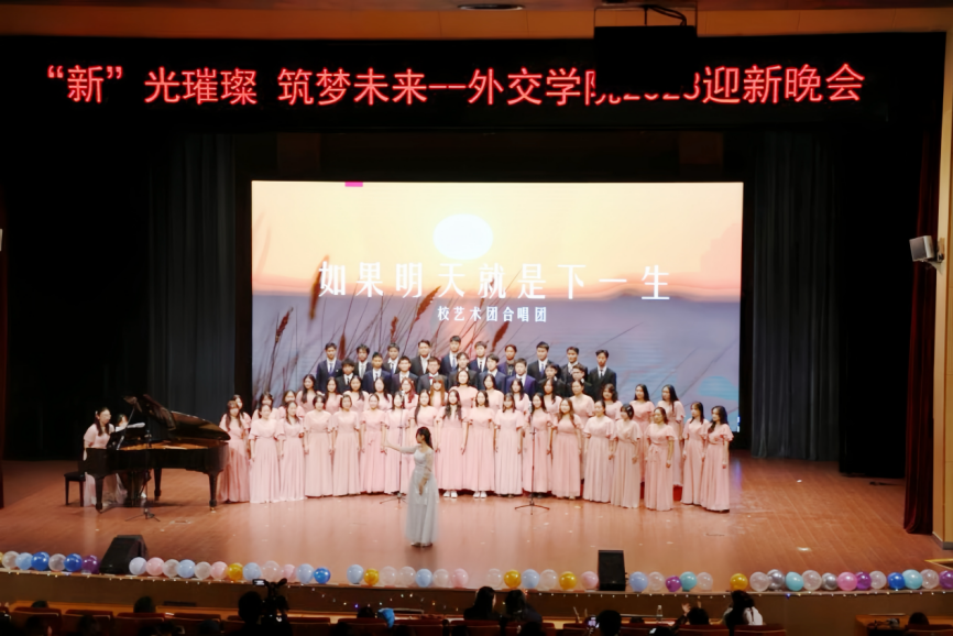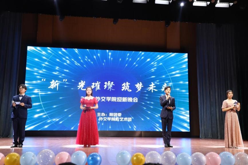 2023年10月22日,由共青团外交学院委员会主办,校艺术团承办的“‘新’光璀璨 筑梦未来”2023迎新晚会在沙河校区礼堂举办。校艺术团合唱团、舞蹈队、戏剧社、器乐社、街舞社、液体音乐社和各院(系、所)同学通过脱口秀、歌唱、舞蹈、戏剧、器乐演奏、戏曲等丰富多彩的节目形式呈现了一场视听盛宴。