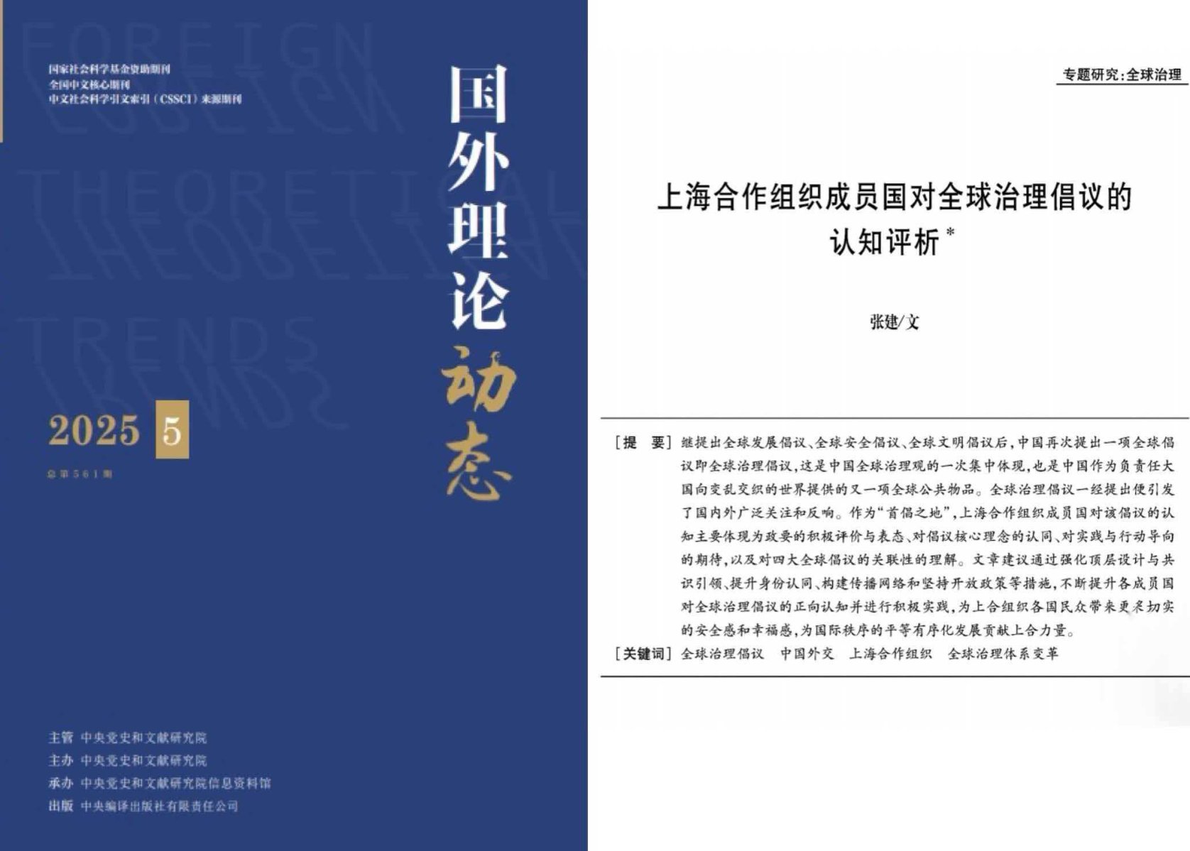 由中央党史和文献研究院主管主办、中央党史和文献研究院信息资料馆承办的综合性理论双月刊、中文社会科学引文索引(CSSCI)来源期刊《国外理论动态》2025年第5期刊发了外交学与外事管理系张建副教授撰写的文章《上海合作组织成员国对全球治理倡议的认知评析》,文章积极宣介了全球治理倡议在海外的热烈反响。