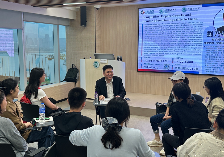 2025年11月8日,应澳门城市大学金融学院的邀请,国际经济学院教师刘乃郗赴澳门城市大学参加经济金融工作坊,并作题为“Export Growth and Gender Education Equality in China(中国的出口增长与性别教育平等)”的论文发言,活动由澳门城市大学许文立老师主持。