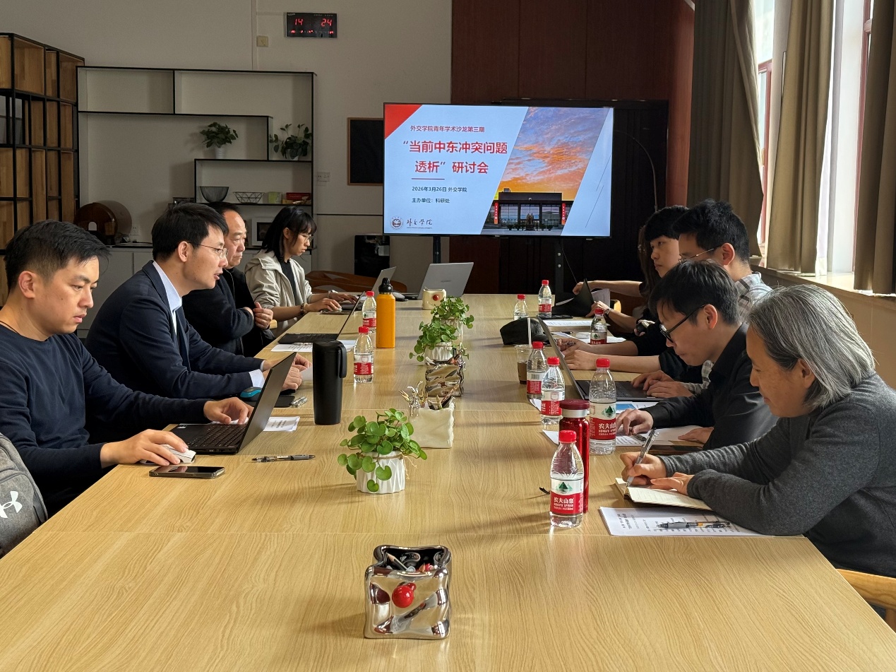 2026年3月26日下午,外交学院青年学术沙龙第三期活动“当前中东冲突问题透析”研讨会在展览路校区成功举办。活动由科研处主办,邀请国际关系研究所高尚涛教授、李海东教授、王思丹副教授、原玥老师,国际法系严文君副教授,国际经济学院李涛老师和外交学与外事管理系吴纪远老师发言,科研处处长凌胜利教授主持。