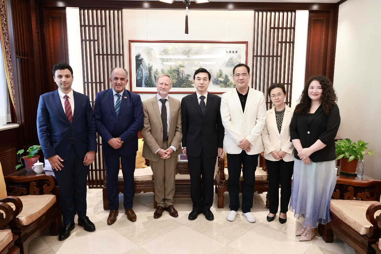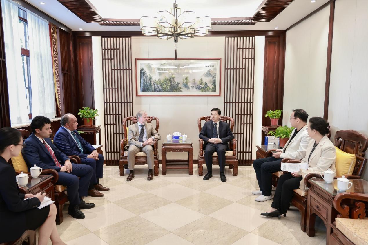 2025年9月17日,王帆院长会见比利时驻华大使安博宁(Bruno Angelet)、突尼斯驻华大使阿迪勒•阿拉比(Adel Elarbi),法兰西道德与政治科学院外籍院士、北京大学燕京学堂院长董强、比利时使馆瓦隆布鲁塞尔国际关系署文化项目负责人赵博、突尼斯使馆一秘阿纳斯·图阿提(Anas Touati)、突尼斯使馆中方秘书张晗婧参加会见,外语系主任王晓侠等陪同会见。